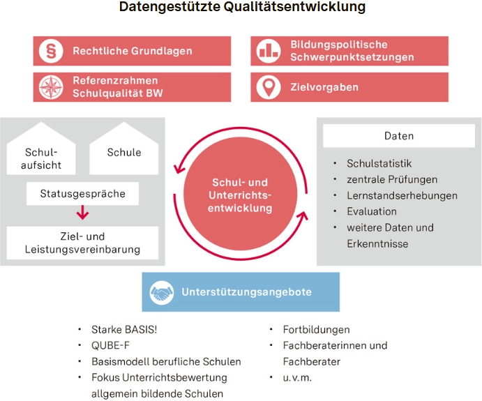 1. § 114 Schulgesetz (SchG) verpflichtet die öffentlichen Schulen zur datengestützten Qualitätsentwicklung und Qualitätssicherung. Dies beinhaltet regelmäßige Evaluationen, die in Statusgespräche und Ziel- und Leistungsvereinbarungen mit den Schulaufsichtsbehörden nach § 32 Absatz 2 SchG einfließen. Das Institut für Bildungsanalysen Baden-Württemberg (IBBW) und das Zentrum für Schulqualität und Lehrerbildung (ZSL) wirken unterstützend an der datengestützten Qualitätsentwicklung und Qualitätssicherung mit.